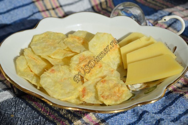 Ингредиенты: Картофель - 250 гр. Соль - 3 гр. Сыр - 50 гр. (желательно твердых сортов) Источник: https://rusdinner.ru/page/chipsy-s-syrom-v-mikrovolnovke