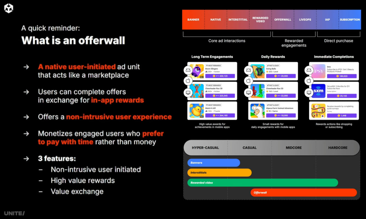 Offerwall — это внутриигровая витрина заданий, где игроки добровольно получают премиальную валюту за конкретные действия: прохождение опроса, достижение уровня в другой игре или регистрация в сервисе. В разработке пока не касался. Но похоже этого уже не миновать, особенно в Mobile. Этот приём развивается достаточно давно, и как пользователь я уже неоднократно с этим сталкивался. Вместо "плати или смотри" приходит "плати или делай". Но рекламу минуту "посмотрел" и закрыл. А тут сходи, набери 1000 очков в вообще другой игре — это намного дольше, не интересно, и требует активного участия. И на очередном пэйволле от этого сложно отмахнуться. С точки зрения пользы для рекламодателей и разработчиков об этом рассказали в докладе The evolution of rewarded engagement с Unite 2025.