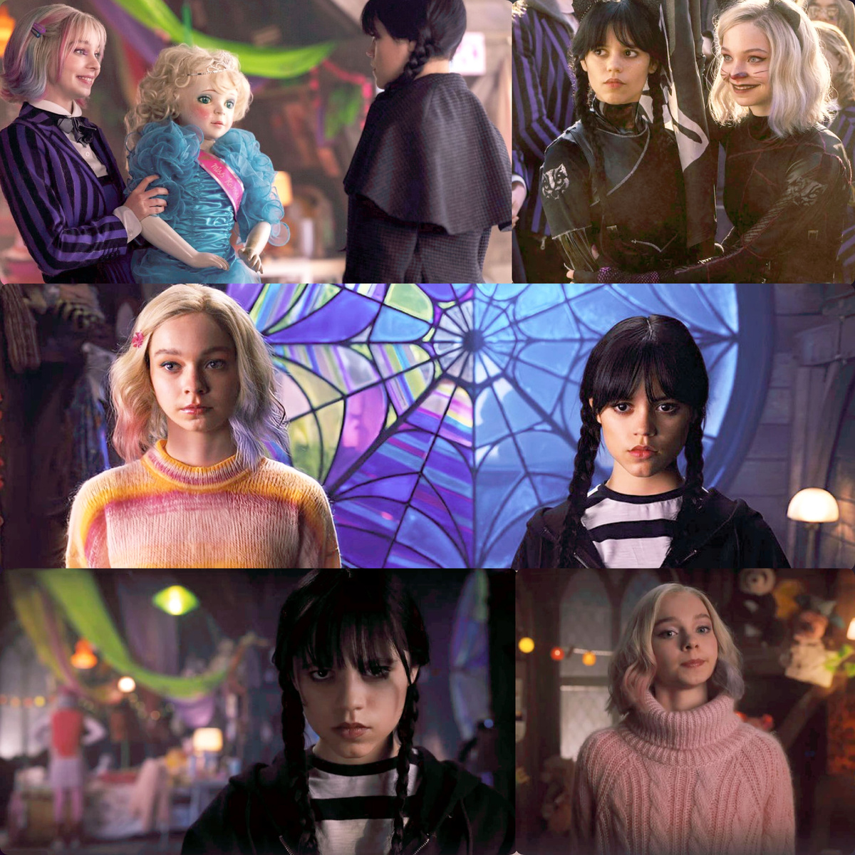 Все начинается с классического конфликта противоположностей. Пессимистичная, ядовитая Уэнсдей, ценящая одиночество, оказывается в одной комнате с гипер-общительной, эмоционально открытой Энид, чей радужный стиль и одержимость соцсетями действуют Аддамс на нервы. Первоначально их связывает лишь вынужденное терпение. Однако именно Энид становится для Уэнсдей первым и часто единственным «мостом» в нормальную социальную жизнь Академии «Невермор».