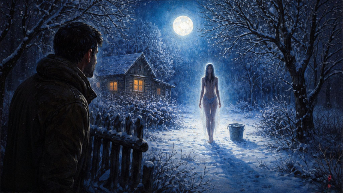 В соседнем огороде, в лунном свете, стояла женщина. Мокрые волосы, сияющая кожа, идеальный силуэт на фоне снега.