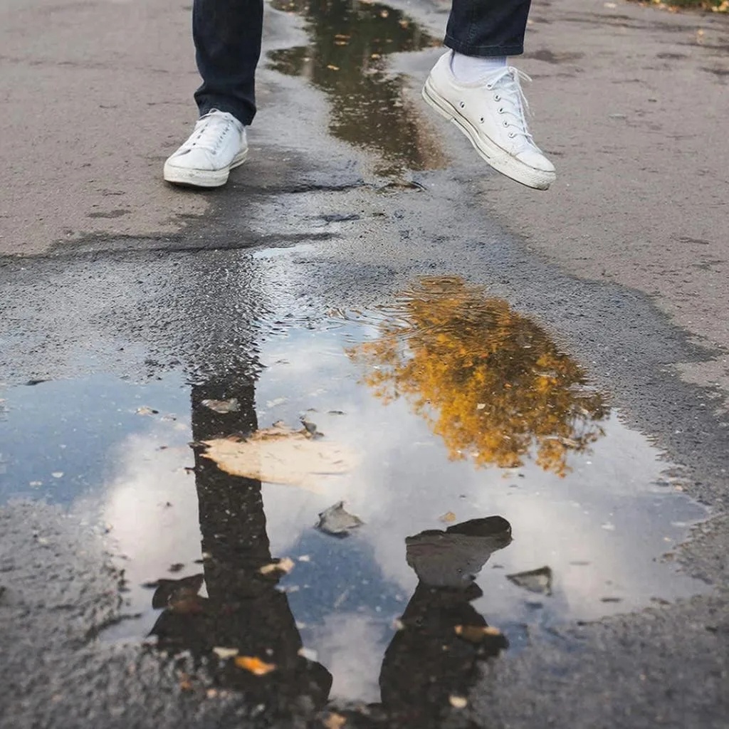 Крупный план ног в простых кедах на фоне мокрого после дождя асфальта. В луже под ногой — размытое, красивое отражение осеннего неба и желтеющих деревьев. Весь кадр — о балансе между шагом здесь-и-сейчас и отражением целого мира вокруг.