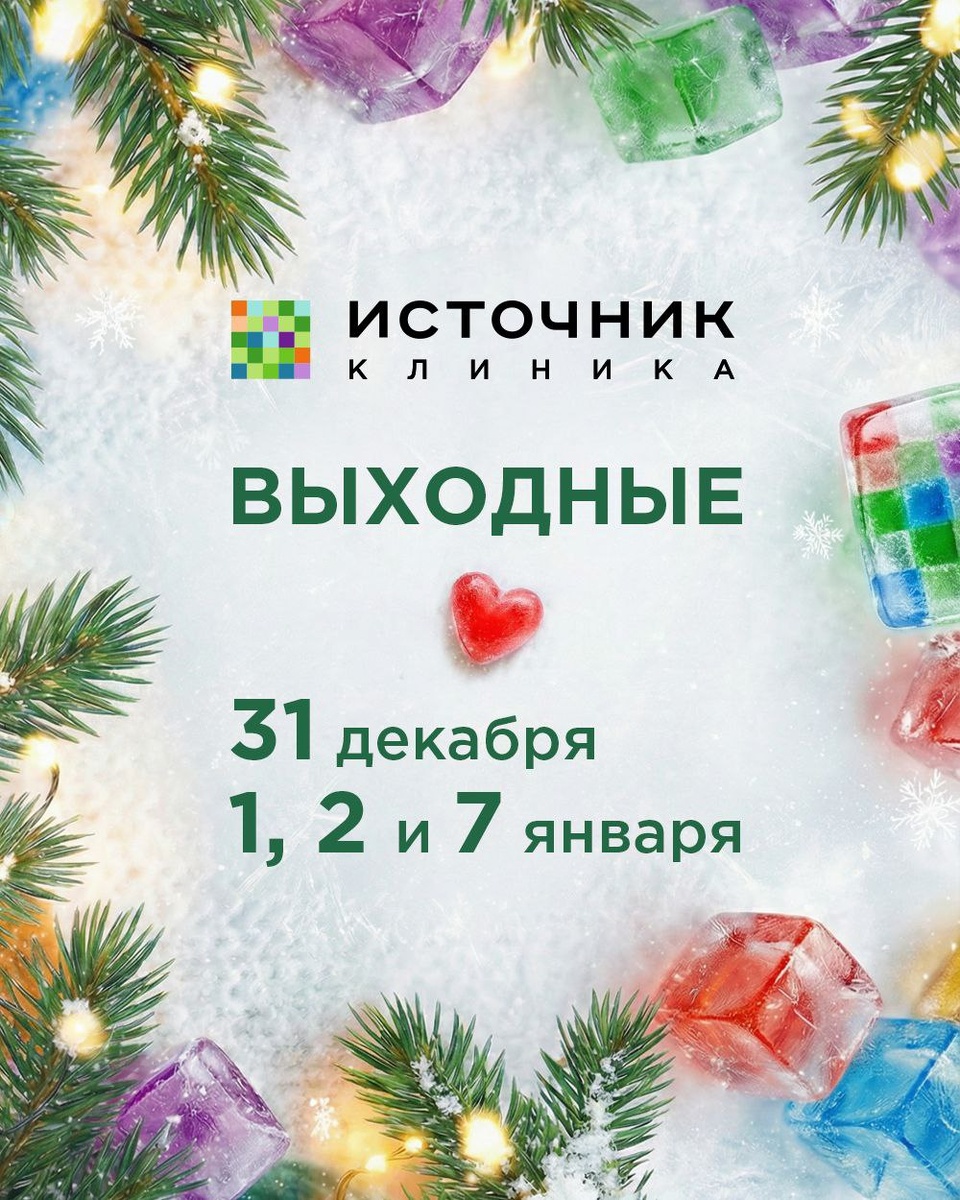 ! Клиника "Источник" вышла с новогодних каникул. Ждем вас на приемы и обследования! Обратите внимание: 7 января нас ждет ещё один выходной день. Пожалуйста, учитывайте это при планировании визита в клинику. ☎Звоните: +7(812) 565-19-28