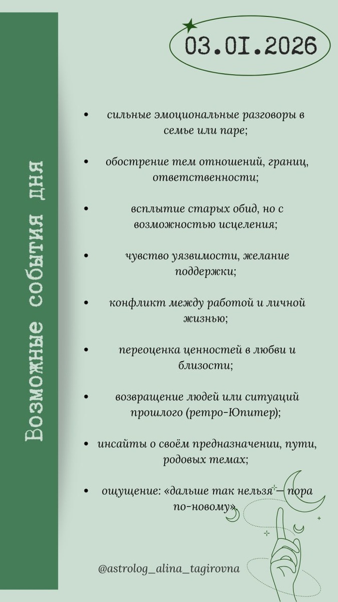 3️⃣ января, суббота В 15:35 начало 1️⃣6️⃣-го Лунного дня В 13:02 Полнолуние в знаке ♋️Рак Общая характеристика дня Сегодня — эмоциональная вершина цикла, точка, где внутреннее и внешнее сталкиваются лоб в лоб. Полнолуние в Раке вскрывает всё, что связано с чувствами, домом, семьёй, безопасностью, привязанностями и прошлым. Оппозиции к Солнцу, Венере и Марсу в Козероге создают мощное напряжение между: чувствами и обязанностями, потребностью в тепле и требованиями реальности, сердцем и контролем, «хочу» и «надо». Соединение Луны с ретро-Юпитером усиливает масштаб эмоций: всё ощущается глубже, больше, сильнее. А гармоничные аспекты к лунным узлам показывают: это Полнолуние кармическое, очищающее, ведущее к верному направлению, если вы готовы быть честными с собой. 16-й лунный день считается днём гармонизации и принятия — после эмоционального пика важно не действовать резко, а выровнять внутренний баланс. Вопросы дня: ❓Где я жертвую собой ради ожиданий?! ❓Что для меня сейчас важнее