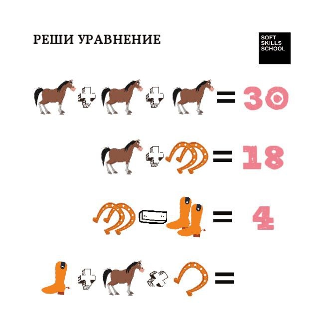 Гибкие навыки лучше тренировать без перерыва и делать это можно интересно. Собрали простые логические задачки для всей семьи. Не отчаивайтесь, если не получится сразу решить. Терпение и труд все перетрут. Желаем успехов! Задача 1. Подсказка: Главное понять, какой цифре равна каждая картинка. Задача 2. Подсказка: не случайно пастух не один. Задача 3. Изначально в аквариуме плавает 10 рыбок. Однако спустя неделю 2 из них утонули, 4 – уплыли, а еще 3 – погибли. Сколько рыбок осталось в аквариуме? Задача 4. Перед вами четыре стакана с водой. В каждом находятся предметы. Так: в первом стакане – металлические наручные часы; во втором стакане – канцелярская скрепка; в третьем стакане – металлические ножницы; в четвертом стакане – ластик. При этом уровень воды во всех стаканах одинаковый. В каком стакане воды больше?