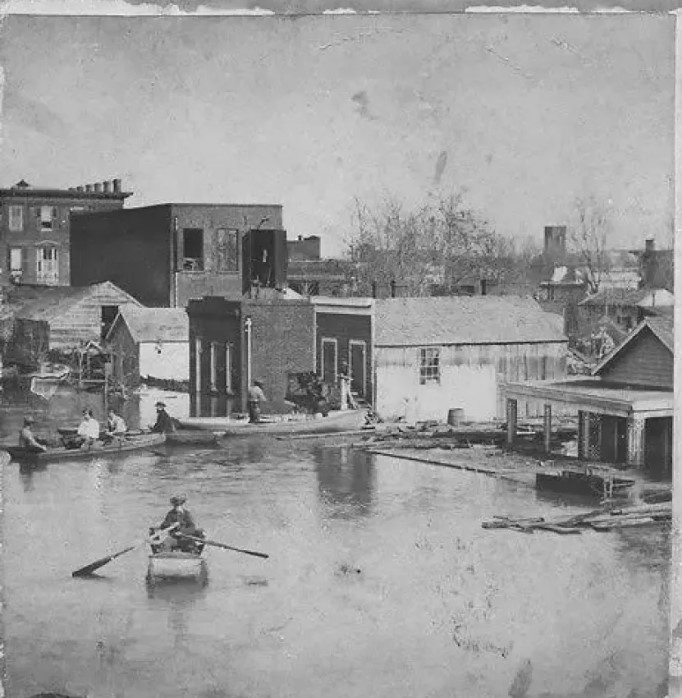Обычно до здания Капитолия можно было дойти пешком. Но в тот день только безумец или отчаявшийся человек решился бы выйти на улицу. Стэнфорд садится в лодку и плывёт — волна за волной — к зданию, где должна состояться его инаугурация. По дороге он проплывает мимо затопленных домов, торчащих из воды телеграфных столбов и трупов лошадей, дрейфующих по течению.
