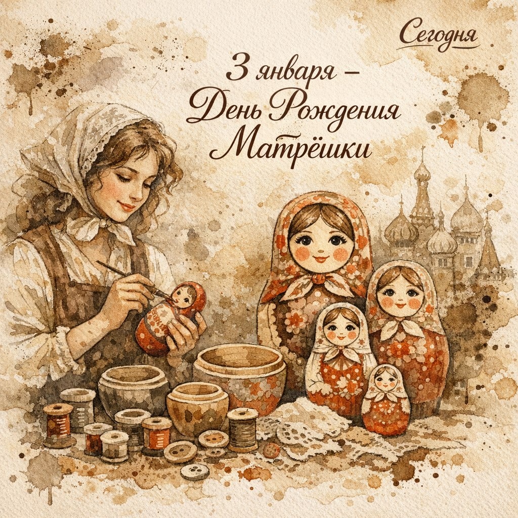 3 января в России отмечают День русской матрёшки — праздник одной из самых узнаваемых визитных карточек нашей страны. Эта удивительная игрушка давно вышла за рамки детской забавы, став настоящим культурным феноменом. Давайте вместе проследим её путь от первых образцов до мировых выставок. История появления матрёшки до сих пор вызывает споры среди исследователей. Существуют две основные версии: Русская версия связывает рождение матрёшки с именем токаря‑игрушечника Василия Петровича Звёздочкина. В 1890 году он, вдохновившись деревянной фигуркой из журнала, выточил первую куклу. Затем художник Сергей Васильевич Малютин придал ей тот самый узнаваемый облик. Японская версия утверждает, что прототипом послужили куколки, привезённые Елизаветой Григорьевной Мамонтовой из Японии. Эти вкладывающиеся друг в друга фигурки изображали «семь богов счастья» — популярный мотив восточной культуры. Первая кукла получила имя Матрёна и представляла собой образ круглолицей крестьянской девочки: Внутри неё