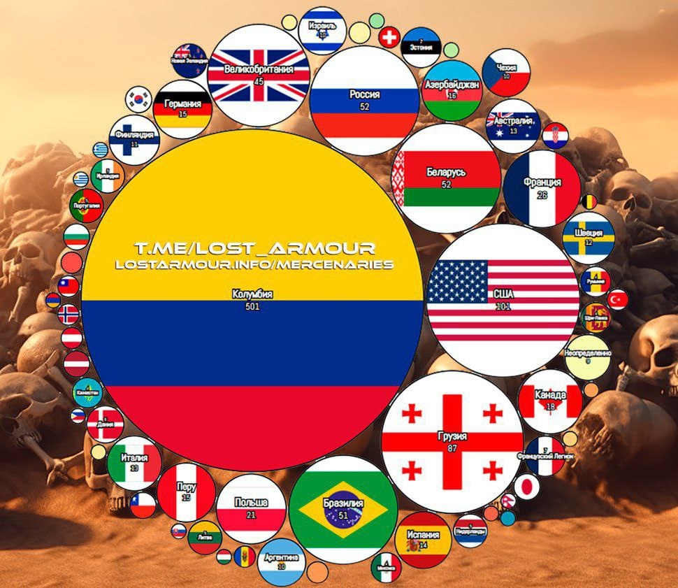 Поименный список уничтоженных в ходе СВО иностранных наемников в рядах ВСУ к началу 2026 года перевалил за отметку в 1200. Бесспорный лидер по поставкам "импортного пушечного мяса" - Колумбия. Уничтожено свыше 500 колумбийских наемников. ТОП-10 стран, граждане которых погибли в рядах ВСУ в ходе СВО. 501 - 🇨🇴 Колумбия 101 - 🇺🇸 США 87 - 🇬🇪 Грузия 52 - 🇧🇾 Беларусь 52 - 🇷🇺 Россия 51 - 🇧🇷 Бразилия 45 - 🇬🇧 Великобритания 26 - 🇫🇷 Франция 21 - 🇵🇱 Польша 18 - 🇨🇦 Канада Инфографика по данным мониторингового сервиса: https://lostarmour.info/mercenaries ❌ Присоединяйтесь https://geochronic.ru 👍Хроники Геополитики👍