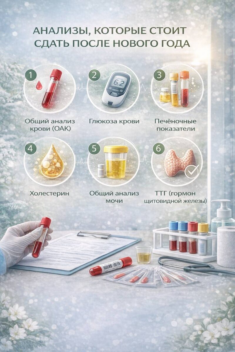 Праздники — это радость, еда, поздние вечера и сбитый режим. Даже если вы чувствуете себя «в целом нормально», организму всё равно нужно внимание. Вот базовый список анализов, которые врачи рекомендуют проверить после Нового года. 🩸 1. Общий анализ крови (ОАК) Показывает: есть ли воспаление как работает иммунитет нет ли анемии Это отправная точка для понимания состояния организма. 🍬 2. Глюкоза крови После праздников уровень сахара часто повышается, даже у тех, кто раньше с этим не сталкивался. Особенно важно, если: была тяжесть сонливость резкие перепады энергии 🧪 3. Печёночные показатели (АЛТ, АСТ, билирубин) Печень первой реагирует на: алкоголь жирную пищу переедание Если есть: горечь во рту тяжесть справа усталость — эти анализы лучше не откладывать. 🫀 4. Холестерин Показывает состояние сосудов и риски для сердца. Важно проверить, если: были «праздничные излишества» есть наследственные факторы давно не сдавали анализы 🦠 5. Общий анализ мочи Помогает оценить работу: почек м