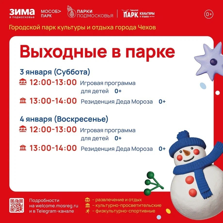 ✨ Выходные в Городском парке Ждём Вас в резеденции Деда Мороза и на игровых программах 🎉 🚫 Возраст: 0+ 🏢 Городской парк культуры и отдыха 📍 г. Чехов, ул. Пушкина, д.1 🪙 Вход свободный❗️ ⭐Поддержать канал голосом ✅ Мероприятия Чехов https://dzen.ru/id/66cc4b48e9ef144699238a51 http://vk.com/chekhov_events http://dzen.ru/chekhov_events