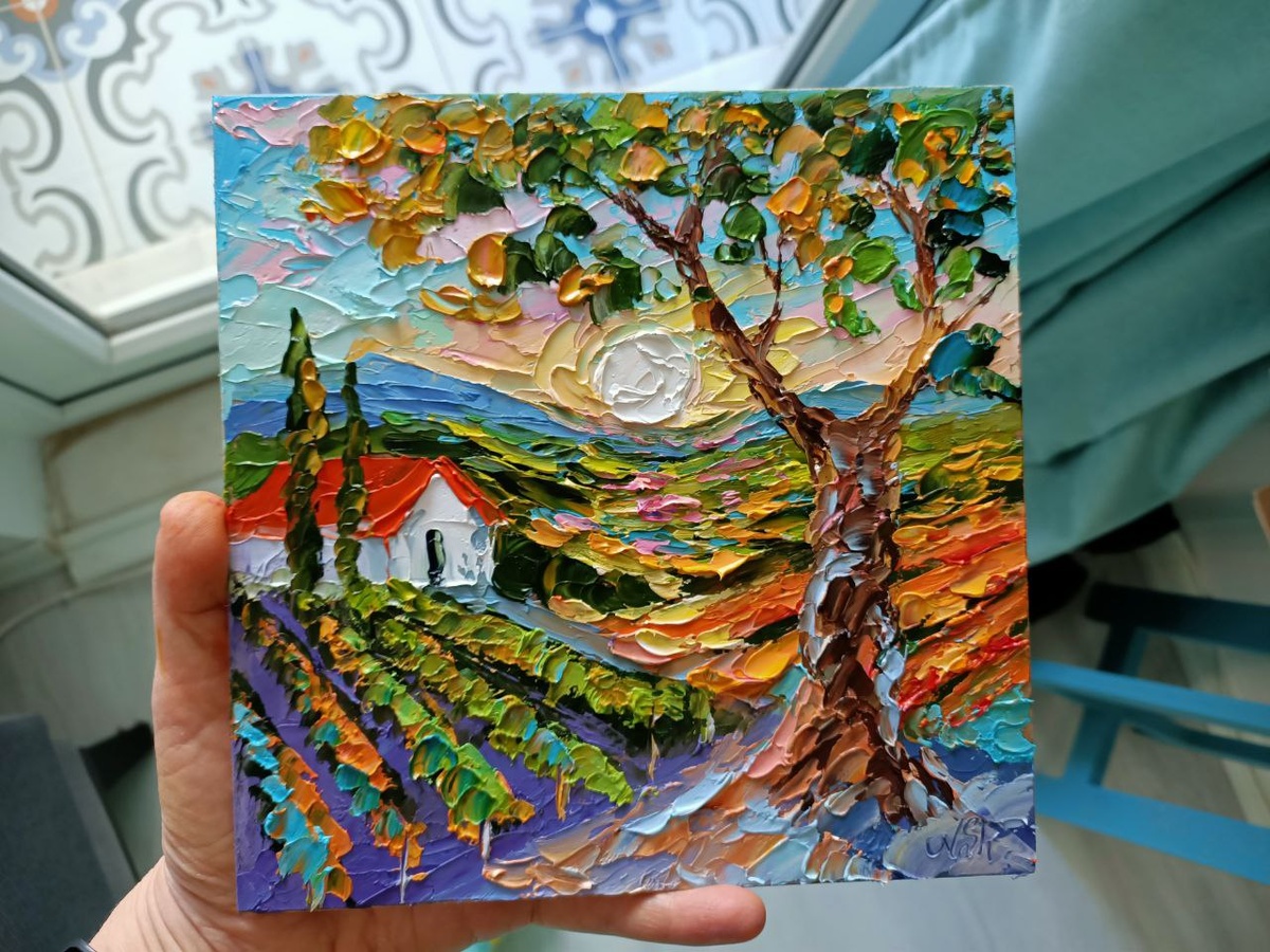 Небольшая картина. Формат 8×8 дюймов за 150 долл. Пейзаж. Дерево. Дом. Свет.