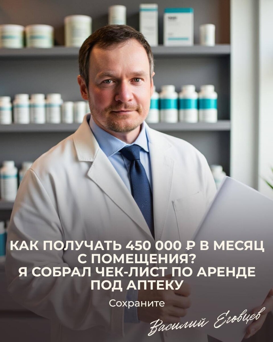 Сохраните. Средний договор аренды у аптек — 5–10 лет. Для собственника это значит одно: объект работает без перебоев, а капитал растёт. Я собрал чек-лист: как считать доходность, на что смотреть и с кем связаться напрямую. 📌 Сохраните этот пост. Он может стать вашей инструкцией, когда придёт время искать арендатора. ⸻ ✅ Чек-лист собственника 1. Посчитайте доходность • Средняя ставка аптеки: 3 000–3 500 ₽ за м². • Помещение 150 м² = до 450 000 ₽ в месяц или 5,4 млн ₽ в год. 2. Примените правило «100 аренд» • Доход 450 000 ₽/мес → объект стоит ≈ 45 млн ₽. • В топовых локациях это может быть чуть выше — до 110–120 аренд, но правило остаётся надёжным ориентиром. • Это честная оценка капитала, а не «цена с воздуха». 3. Узнайте реальные требования • Например, у Риглы и 36.6 требования: площади от 40 до 150 м², первый этаж, отдельный вход, санузел. 4. Почему аптека = надёжный арендатор • Долгие договоры (5–10 лет). • Спрос всегда высокий, кризис только усиливает. • Ассортимент расши