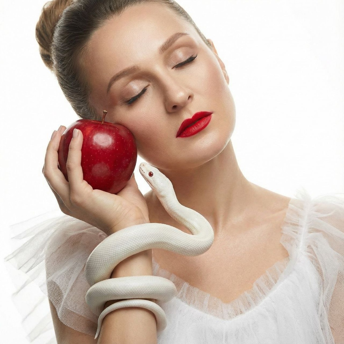 Не меняйте выражения лиц. Лица должны быть полностью сохранены, как на оригинальных фотографиях. Крупный план женщины с закрытыми глазами, держащей ярко-красное яблоко у щеки; белая змея с красными глазами обвивается вокруг ее руки, держащей яблоко, и поднята головой к яблоку; ракурс прямой, женщина держит яблоко в руке; композиция – крупный вертикальный снимок с фокусировкой на ее лице и голове змеи; на губах красная помада; она одета в белое тюлевое платье с оборками; волосы собраны в гладкую прическу. Обстановка – белая студия, яркое и мягкое освещение сбоку и немного сверху, создающее мягкие, едва заметные тени и сияющее, воздушное свечение кожи; высокий контраст между светлыми тонами и глубоким красным цветом яблока; съемка телеобъективом для портретов, например, 135 мм; чрезвычайно малая глубина резкости; высокая детализация, фотореалистичность ➡️ Тут БОТЫ 👉 канал в Дзен 💰Отблагодарить