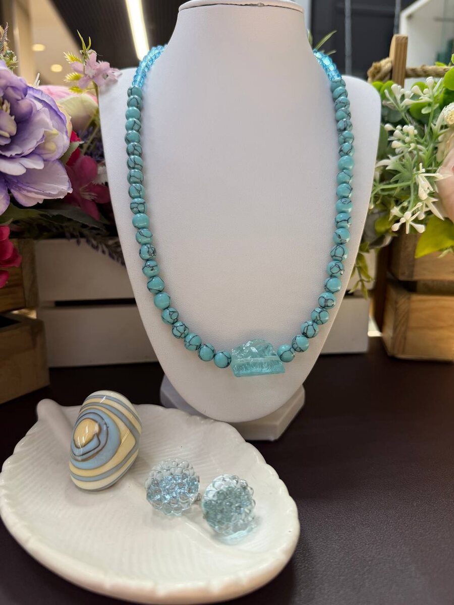 🩵 Холодный бирюзовый — как чистая вода в солнечный день. Бусины с природным рисунком никогда не повторяются, а центральный элемент выглядит так, будто его нашли на дне океана, а не придумали. Колье можно дополнить кольцом в похожих цветах и полупрозрачными пусетами цвета тёплого океана. Если хочется добавить образу свежести и характера — присмотритесь поближе к этим аксессуарам. Колье 5100 Кольцо 3600-15%=3 060 Серьги 4200-15%=3 570 ✨Нажмите для заказа ✉️ Нажмите чтобы задать вопрос