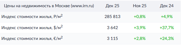 По данным аналитического центра www.irn.ru в 2025 году имел место умеренный рост цен на готовое жилье в столице. Индекс стоимости жилья прибавил за год чуть менее 5%, поднявшись с 272,5 до 285,8 тысяч рублей за квадратный метр (без учета элитного жилья). Это чуть меньше официальной инфляции, которая по итогам 2025 года по многим оценкам окажется в диапазоне 5-6%. То есть можно констатировать, что готовое жилье в 2025 году дорожало примерно на уровне инфляции.