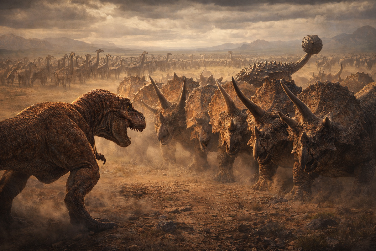 Но теперь посмотрите вперед. На вас медленно, как один живой бастион, разворачивается трицератопс. Его костяной воротник — неприступная стена. Три рога направлены прямо на вас, каждый длиной с вашу голень. Рядом с ним встает анкилозавр, приседающий, как средневековый рыцарь, чтобы взмахнуть хвостом с костяной булавой. А за ними — целое море спин, клювов и внимательных глаз.