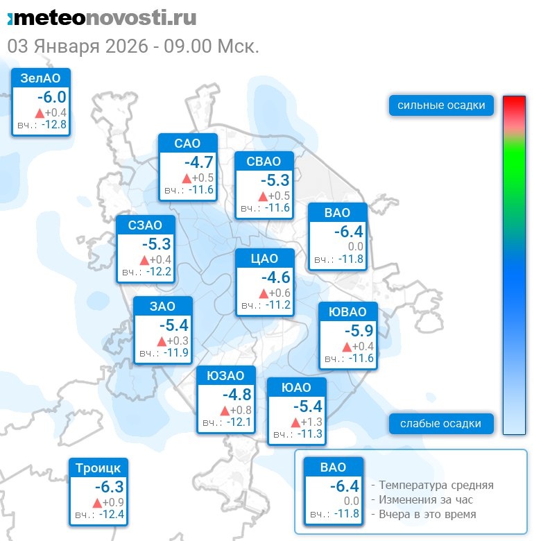 В 9:00 в Москве было от -7.4°C до -4.2°C, средняя температура -5.4°C #погода #Москва #зима #температура #3января #суббота