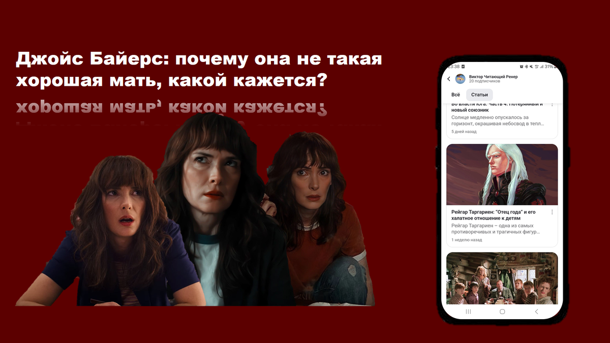 Джойс Байерс — один из центральных персонажей сериала «Очень странные дела». Её история начинается с того, что младший сын пропадает из дома, и она, не веря, что тот мог погибнуть, начинает его поиски. В целом, это очень яркий персонаж в исполнении потрясающей Вайноны Райдер. Но теперь, когда уже вышел финал этого отличного сериала, мне есть что сказать о ней.