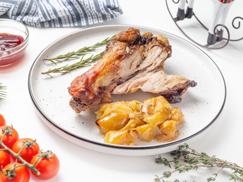 📖 Ингредиенты: · Индейка (плечо) – 1 шт. · Яблоки кислые – 1-2 шт. · Сливочное масло – 80 г · Лимон (цедра) – 8 г · Чеснок – 2-3 зубчика · Розмарин, тимьян – по 2-3 веточки · Соевый соус – для соуса · Соль, перец – по вкусу 🧑🍳 Приготовление: 1. Ароматное масло: В кастрюле растопите сливочное масло с цедрой лимона, раздавленным чесноком, розмарином и тимьяном. Доведите до появления коричневого осадка и процедите. 2. Подготовка: Нарежьте яблоки крупными дольками. Щедро смажьте индейку и яблоки процеженным ароматным маслом, посолите и поперчите. 3. Обжарка: Обжарьте индейку в хорошо разогретой сковороде до румяной корочки с двух сторон. В этой же сковороде обжарьте яблоки. 4. Запекание: В рукав для запекания переложите смесь трав и цедры, сверху уложите яблоки, а на них — индейку. Плотно закрепите рукав и запекайте при 180°C около 90 минут. 5. Соус: Из сока, оставшегося в рукаве, сварите соус, уварив его с соевым соусом на среднем огне до загустения. 6. Подача: Подавайте индейку с