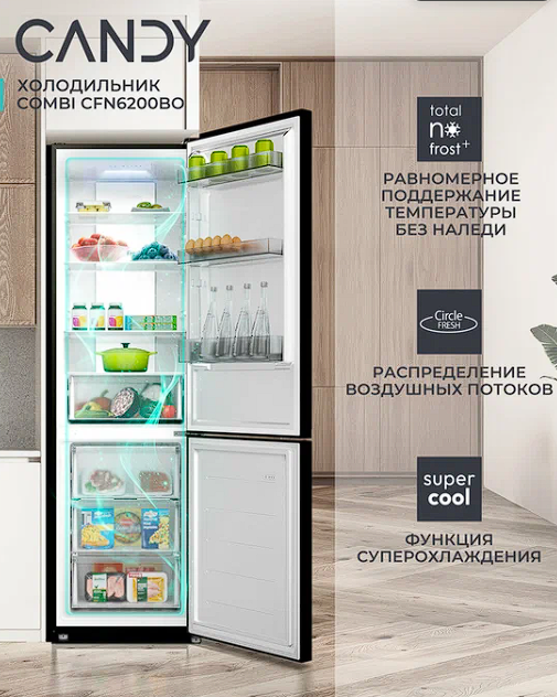 Устали от «белого шума» на кухне? В смысле — от скучного белого холодильника, который сливается со стеной и вечно гудит, напоминая о счетах за электричество? Пора сменить пластик на элегантную матовую черноту и обрести тишину. Представляем Candy CFN6200BO в цвете «Черный обсидиан». Это не просто холодильник. Это — стильный, умный и невероятно практичный монолит, который работает так, что вы его почти не замечаете. Пока он незаметно создаёт ваш идеальный микроклимат. Почему ваша кухня ждёт именно его? Глубокий матовый «Черный обсидиан» — это статус. Он не собирает отпечатки, выглядит дорого и современно, превращая бытовую технику в элемент дизайна. Он больше не прячется — он задаёт тон. Забудьте про разморозку навсегда. Система No Frost в обеих камерах — это ваш личный времясберегатель. Никакого льда, лужиц и сломанных ножей. Вы просто пользуетесь холодильником, а он заботится о себе сам. 334 литра полезного пространства в корпусе шириной всего 60 см. Это магия грамотной инженерии.