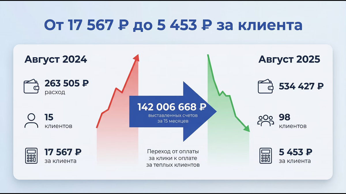 Бюджет х2, количество привлеченных клиентов х6, стоимость привлечения в 3 раза ниже. А еще перестали платить за клики, обуздав алгоритмы Яндекса.