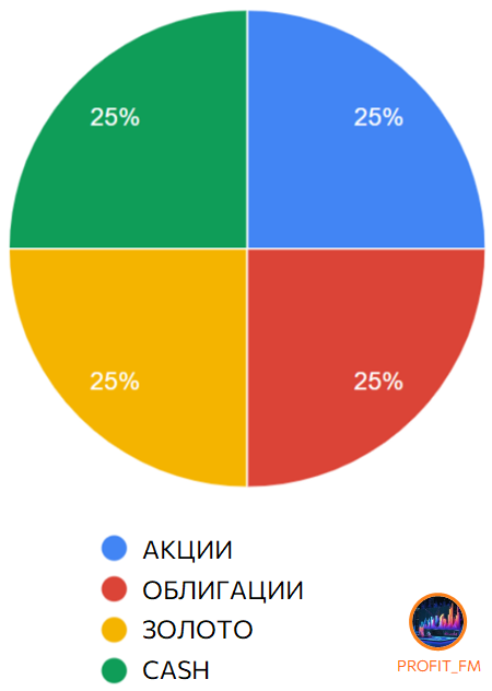 Суть портфеля заключается в том, чтобы разделить все активы на четыре равные части: