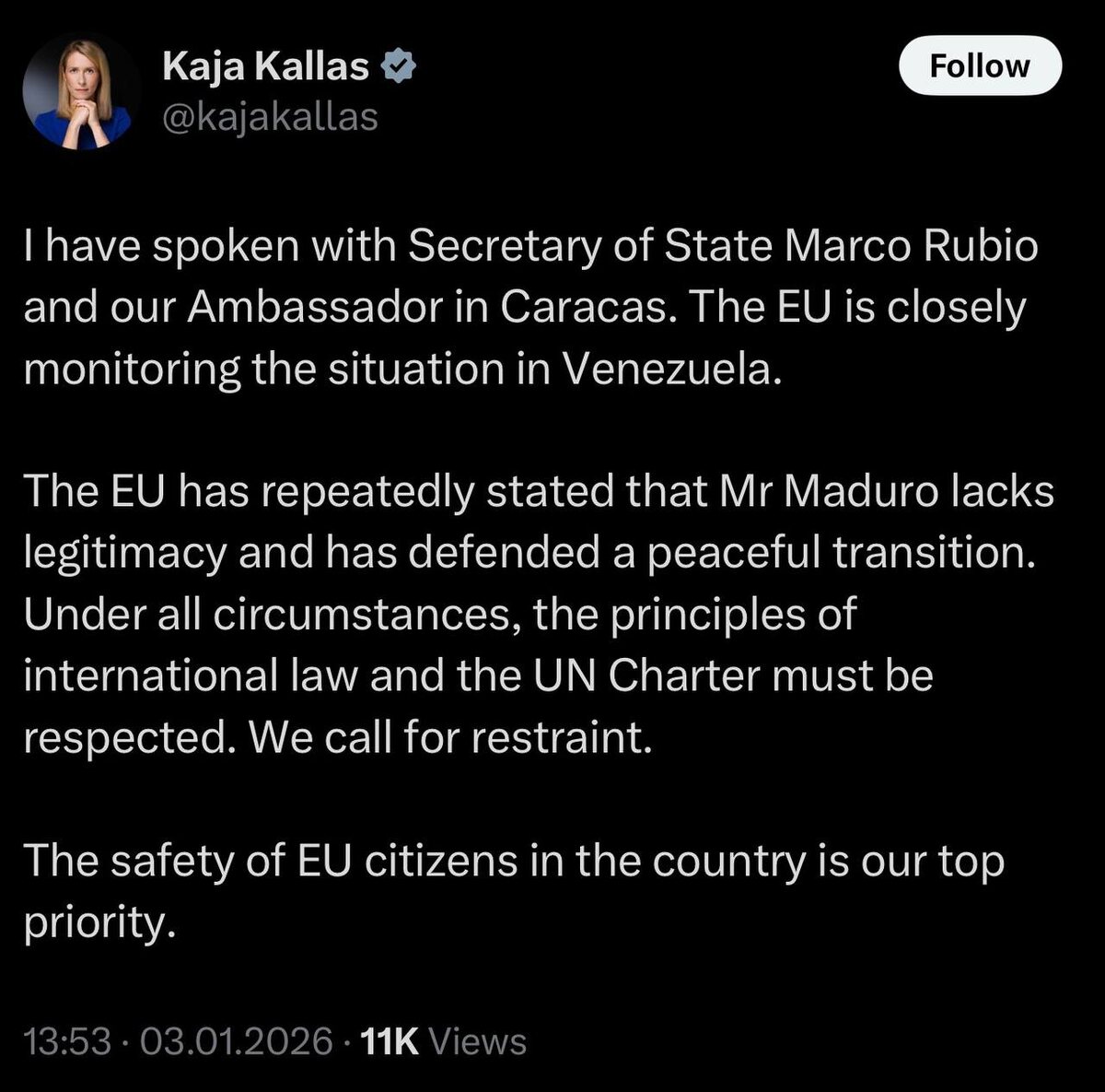 EU's Kallas holds calls with Rubio and EU Ambassador in Caracas She confirms the EU is closely monitoring the Venezuela situation and reiterates that Maduro lacks legitimacy