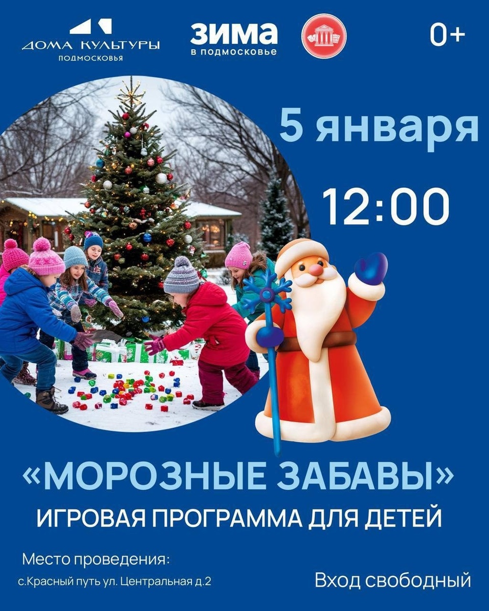 ✨ Как же здорово, когда в продолжительные зимние выходные дни можно сходить куда - нибудь погулять и развлечься всей семьей! ☃️☃️☃️☃️ ☃️☃️☃️☃️☃️ 5 января в 12.00 СДК «Русь» приглашает всех на игровую программу «Морозные забавы» ☃️☃️☃️☃️☃️☃️☃️☃️☃️ Ждём всех! 🚫 Возраст: 0+ 📆 05.01.2026🕒12:00 🏢 Сельский дом культуры (СДК) «Русь» 📍 г.о.Домодедово, с.Красный Путь, ул.Центральная, д.2 💰 Вход свободный❗️ ✅ Мероприятия Домодедово https://dzen.ru/id/66f10385cc4c5a16f7b5fb02 http://vk.com/domodedovo_events http://dzen.ru/domodedovo_events