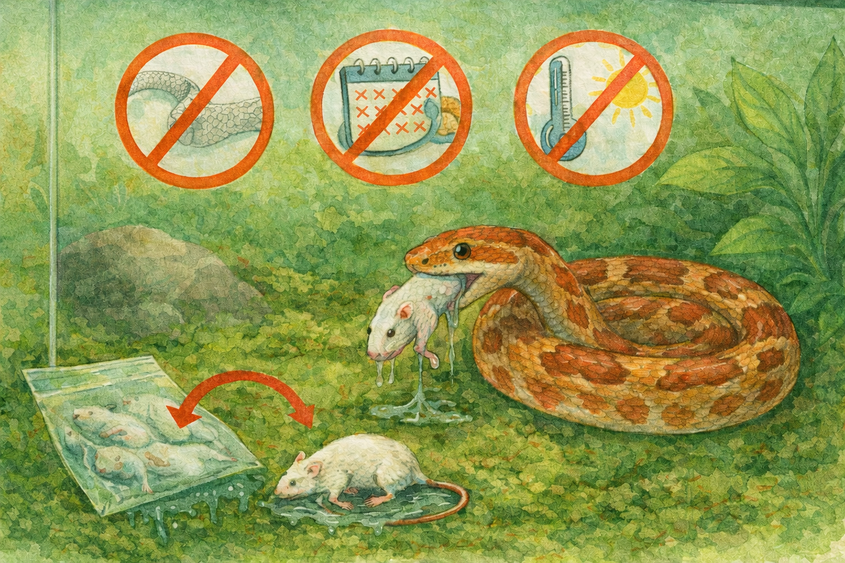 ✔ Правило простое: корм не должен быть шире самой толстой части тела змеи. Частые кормления: