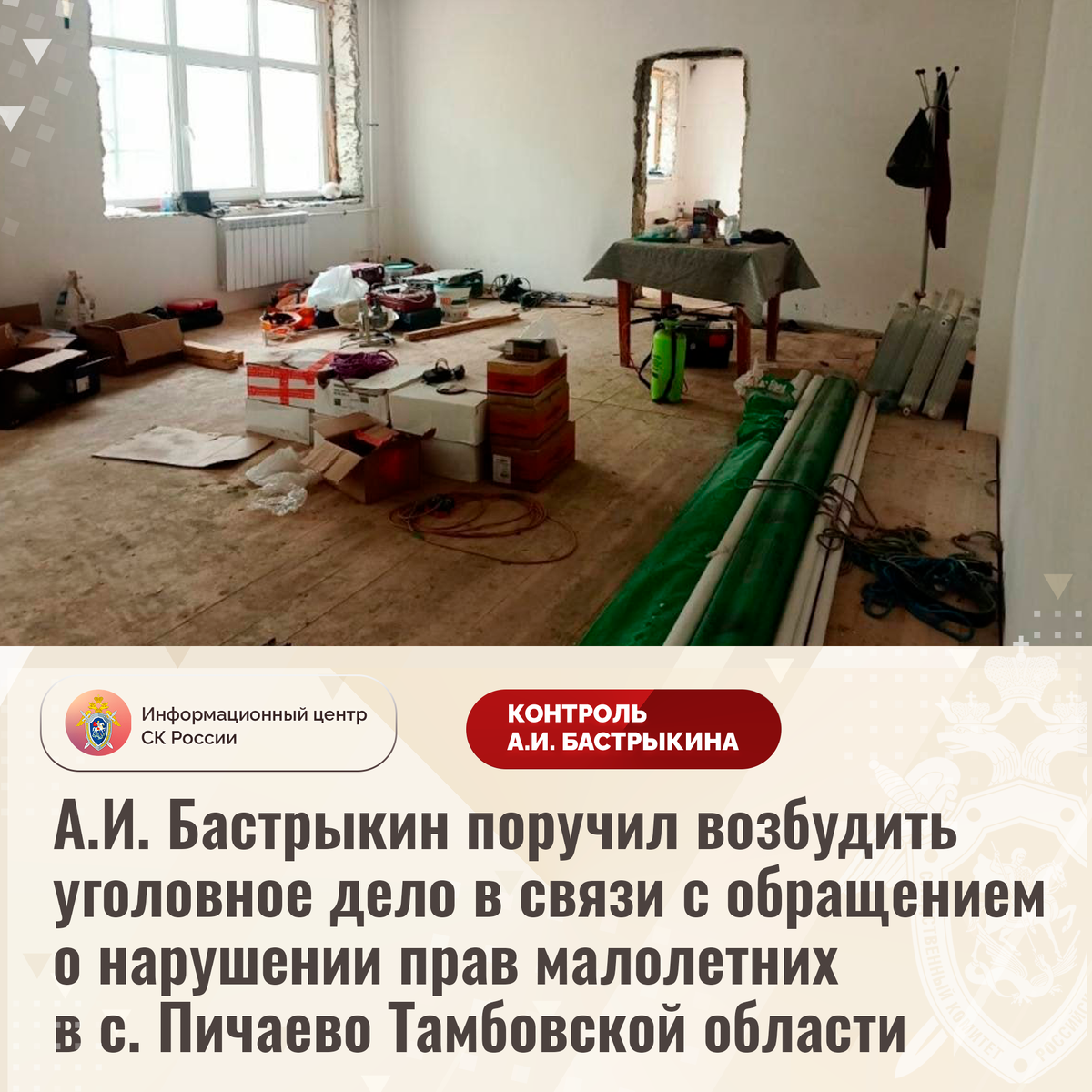 А.И. Бастрыкин поручил возбудить уголовное дело в связи с обращением о нарушении прав малолетних в с. Пичаево Тамбовской области В Информационный центр СК России поступило обращение по вопросу нарушения прав малолетних в селе Пичаево Тамбовской области. В марте прошлого года в здании единственного в населенном пункте детского сада начато проведение капитального ремонта, срок завершения которого неоднократно переносился, последний раз – на декабрь 2025 года. Однако до настоящего времени сотрудниками подрядной организации работы не завершены. Отмечается, что для нужд дошкольного учреждения в местной школе временно выделено лишь несколько кабинетов, из-за чего посещать его имеют возможность ограниченное количество воспитанников. При этом указанные помещения не оборудованы должным образом. Обращения родителей в различные инстанции результатов не принесли. Ранее указанная ситуация освещалась в СМИ. А.И. Бастрыкин поручал представить по ней доклад. В СУ СК России по Тамбовской области провод