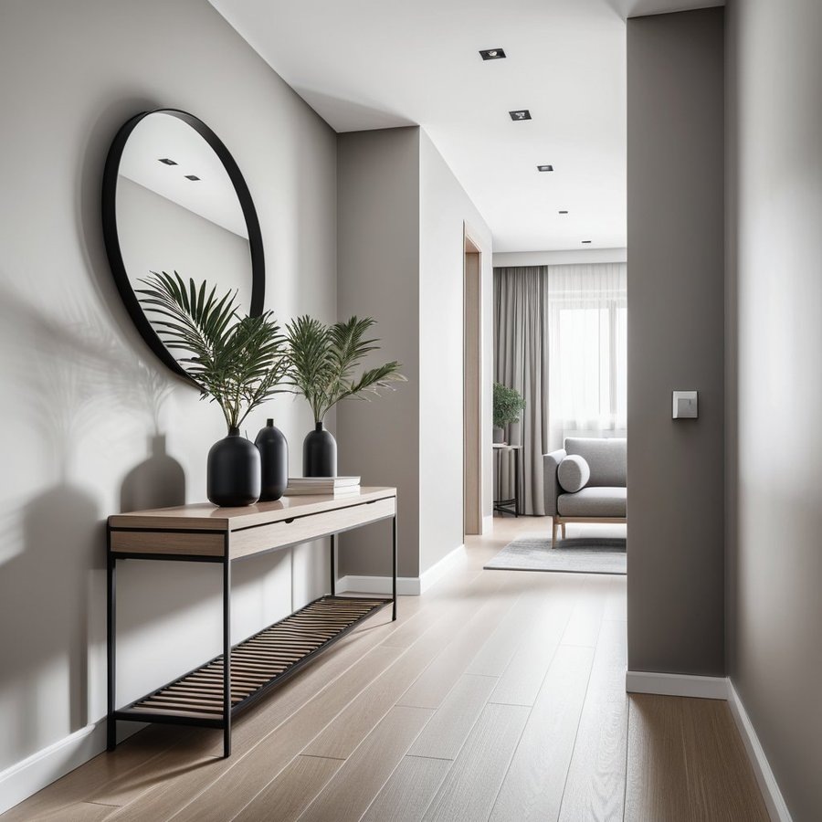 Аксессуары также должны быть тщательно подобраны: зеркала без рамок, стильные вешалки и минималистичные светильники добавляют завершенности. Обратите внимание на материалы - натуральное дерево, металл и стекло гармонично вписываются в общий стиль. Правильное освещение, мягкие текстуры и продуманные детали создают уютную атмосферу, делая прихожую не только функциональной, но и стильной.