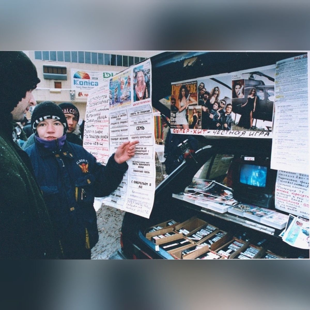 На первом снимке мы видим "Обзор новинок кино", сделанный на Горбушке в середине 90-х. Это место стало настоящим центром притяжения для любителей кино, где можно было найти самые свежие релизы и обсудить их с другими киноманами.