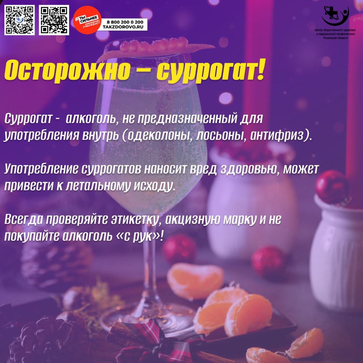 ». Это смертельная ловушка. Что скрывается за этим словом? Поддельный коньяк с рук, «Боярышник», технические жидкости — всё, что содержит метанол или этиленгликоль. 30-100 мл могут убить или сделать инвалидом. Почему это опасно? · Не отличить от нормального алкоголя по вкусу или запаху. · Приводит к слепоте, отказу почек, смерти. · Жертвами становятся не только зависимые, но и обычные люди, купившие контрафакт. Как себя обезопасить? Покупайте алкоголь ТОЛЬКО в проверенных магазинах с акцизными марками. Никаких сомнительных сделок «с рук». Ваша жизнь — не поле для экспериментов. Выбирайте осознанно. #ОсторожноСуррогат #НетКонтрафакту #ЖизньДороже #ЗдоровоеБудущее62 #РязаньНовогодняяСтолица #здоровоебудущее #ЗдороваяРязань