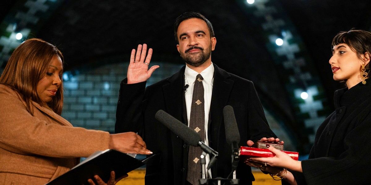 Сразу после полуночи 1 января, на закрытой церемонии в здании бывшей станции метро «Сити-холл» на Манхэттене, генеральный прокурор Нью-Йорка Летиция Джеймс привела к присяге на Коране Зорана Мамдани в качестве мэра Нью-Йорка. Несколько часов спустя сенатор Берни Сандерс (независимый от штата Вермонт) публично привел Мамдани к присяге на церемонии на ступенях мэрии.