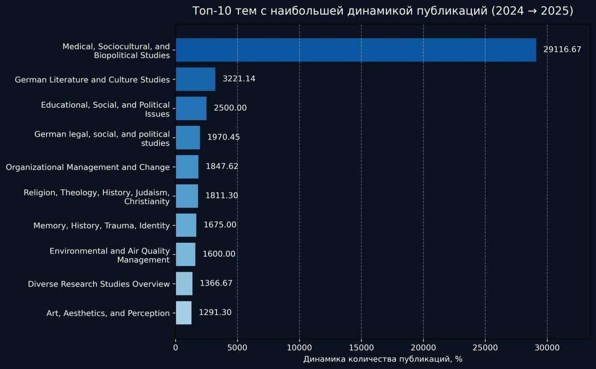 Коллеги с ТГ канала "Выше квартилей" подвели некоторые (не-)ожиданные наукометрические итоги ушедшего года на открытых данных OpenAlex и предложили взглянуть на то, какие темы значимо прибавили с точки зрения показателей и какие из российских публикаций уходящего года оказались наиболее заметными в исследовательском пространстве в 2025 году на конец декабря. Так, топ-10 тематик (выбирали primary topic) по приросту статей в 2025 году (в сравнении с 2024 годом по миру) с большим отрывом возглавил топик «Medical, Sociocultural, and Biopolitical Studies»: количество публикаций выросло сразу на 29 117 %. Остальные темы, включая «German Literature and Culture Studies» с динамикой в 3 221 % и «Educational, Social, and Political Issue» с 2 500 %, показали не такие фантастические, но все же довольно заметные цифры прироста. Отметим, что первый случай объясняется довольно необычно: в Zenodo было загружено сразу 1694 работы, подавляющее большинство которых от авторов из Узбекистана и посвящены в