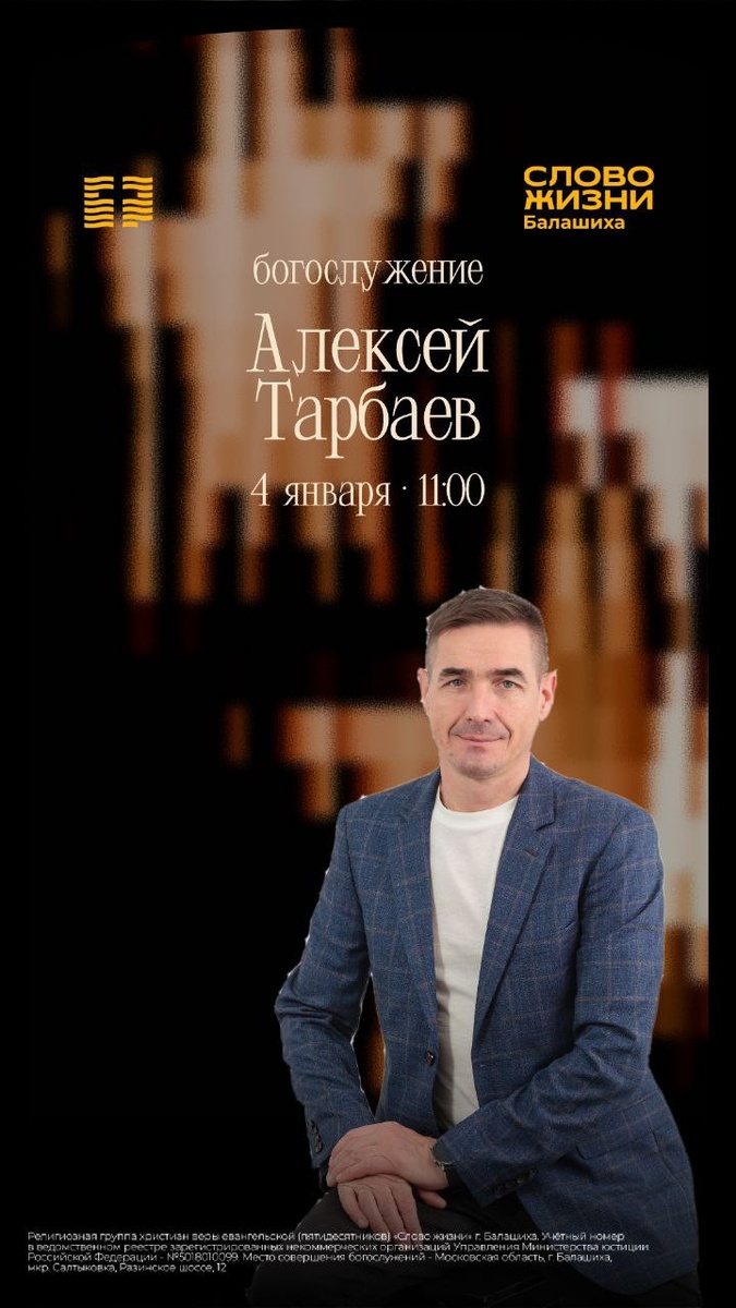 В воскресенье, 4 января, на богослужении проповедует пастор Алексей Тарбаев. Начало в 11:00.