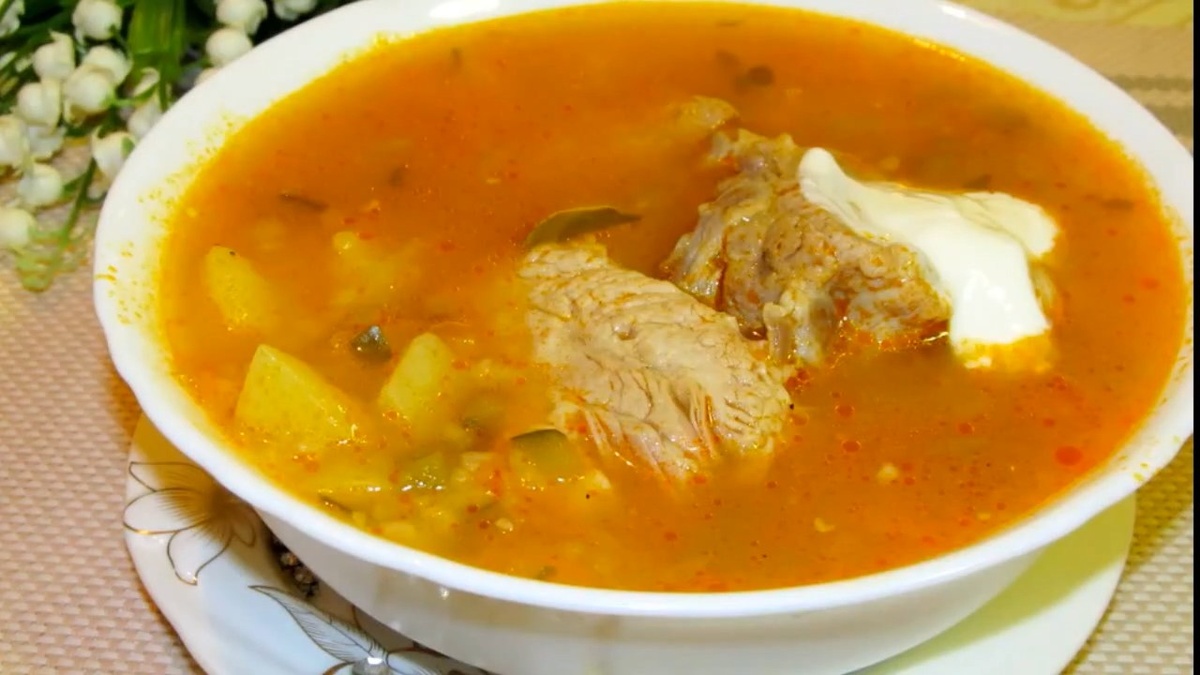 Густой, наваристый суп! Но аромат его, друзья, аромат обязательно порадует. Всегда готовлю его со своими солёными огурцами. По особенному солю их, с набором ароматнейших трав. Их аромат рассольнику передаётся, представляете это, да? А эта кислинка приятная просто притягивает! Готовим! Вот набор продуктов для него. Всё напишу в конце. В первую очередь варим бульон. Мясо в воду, солим. После закипания снимаем пену. Так делают большинство, но я после закипания чаще сливаю воду. Заливаю мясо чистой водой и варю. Пока варится мясо подготовлю овощи. Одну луковицу мелко нарезаю, морковь тру на тёрке, огурцы нарезаю кубиками. На растительном масле поочерёдно обжариваю их. Сначала лук, станет прозрачным добавляю морковь. Лук пожелтел выкладываю огурцы. Все овощи обжариваю вместе минуты три. Дальше добавляю томатную пасту, обжариваю ещё минуту и вливаю 100 мл воды. Тушу всё 7