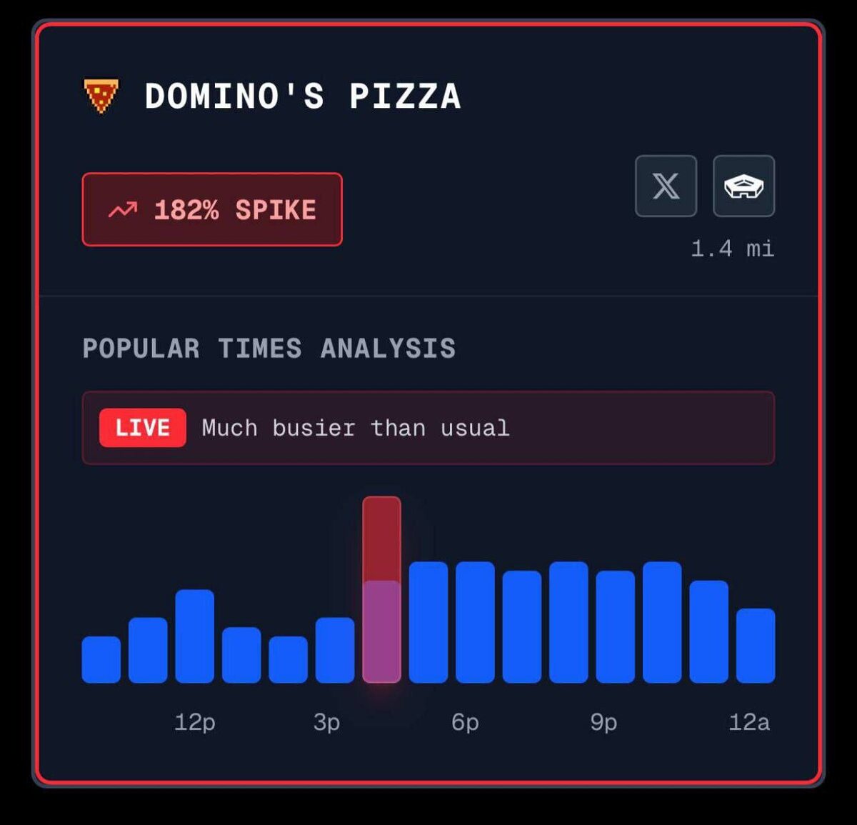 Это популярная метрика, по которой отслеживают загруженность военных: если в ближайшей к Пентагону пиццерии много заказов, значит, военные США заняты подготовкой большой операции. ⚡️Молния. Все новости тут!