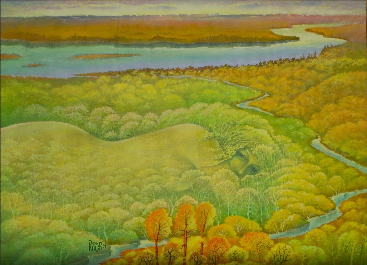 » На картине изображен живописный ландшафт Артемовских лугов, где гармонично сочетаются реки и холмы, покрытые зеленью. Разнообразие оттенков жёлтого, зелёного и оранжевого создаёт ощущение насыщенности и теплоты. В ландшафт лаконично вписан образ прекрасной девушки, окутанный кроной деревьев, олицетворяющий Мать природу. Ее обнаженная натура показывает беззащитность природы перед человеком, и её нежность вызывает глубокую печаль, как напоминание о том, что истинная красота уязвима и требует бережного отношения. Благодарим автора картины — Леонида Колосова! 🐧 Ближе к природе с АртЛугами