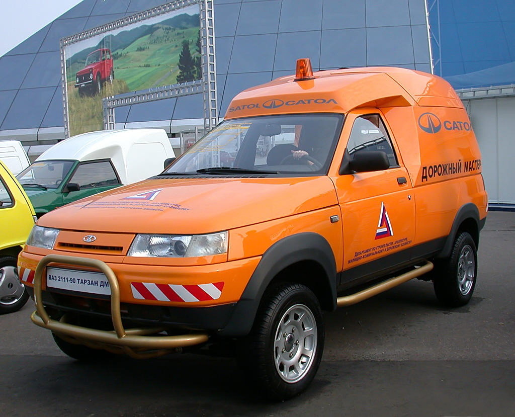 ВАЗ-2111-90 «Тарзан ДМ» «Дорожный Мастер». В отличие от базового ВАЗ-211190 «Тарзан-2», эта модель получила увеличенный объём кузова для размещения специального и ремонтного оборудования различного назначения. Производился предприятием ЗАО "Сатол" для оперативной доставки рабочего персонала к месту поломки или обслуживания специальной дорожной техники и дорожного оборудования. Автомобиль мог комплектоваться в соответствии с поставленными задачами, и был оснащён прицепным устройством для транспортировки специально разработанного прицепа с возможностью загрузки в него малой техники и оборудования общим весом до 1000 кг. Впервые был показан в 2001 году. З.Ы. Lada Tarzan — семейство внедорожных легковых автомобилей, выпускавшихся АвтоВАЗом. Представляет собой модификации на базе моделей «Нива», с кузовами от других моделей ВАЗ. Летом 1998 г. АвтоВАЗ выпустил три модели рамного внедорожника «Тарзан»: ВАЗ 2108−34 (ВАЗ 21083-34) — кузов ВАЗ 2108, ВАЗ 2109−34 — кузов ВАЗ 2109 и ВАЗ 21099−34 —
