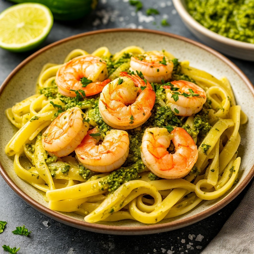 Всё, готово! Подаём пасту с креветками и соусом песто сразу же, пока она горячая. Можно посыпать сверху тёртым пармезаном и украсить листиком базилика для красоты. Готовьте с удовольствием и наслаждайтесь каждым кусочком.