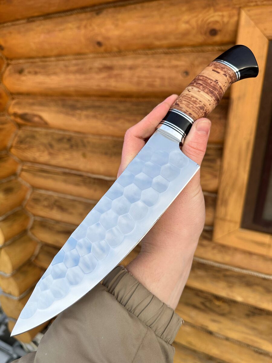! Преимущество: Клинок из отечественной нержавеющей стали 95Х18 в полном камне — это не только надёжность и долговечность, но и легкость в уходе. *Матовое каменное покрытие предотвращает налипание продуктов*, облегчая работу даже с самыми сочными ингредиентами. Рукоять из натуральной бересты — всегда тёплая, не скользит даже во влажной ладони и не впитывает запахи. Заточка — в бритву: нож сразу готов к тонкой нарезке и филировке. Твердость клинка — 58 HRC: оптимально для кухонных ножей — острый, прочный, устойчивый к износу. В комплекте — ножны из натуральной кожи. *Возможно изготовление формованных ножен* (+8000 ₽). Цена: 11 440 ₽ 📩 Для заказа пишите: Telegram: [@Nazarklinokbot](https://t.me/Nazarklinokbot) WhatsApp/Viber: [ +79101343831](https://wa.me/79101343831) Наш канал MAX -> подписаться #кузницаназарова #шефнож #кухонныйнож #ножручнойработы #95х18 #береста #ручнаяработа #кухонныеножи #подароккулинару #nazarklinok
