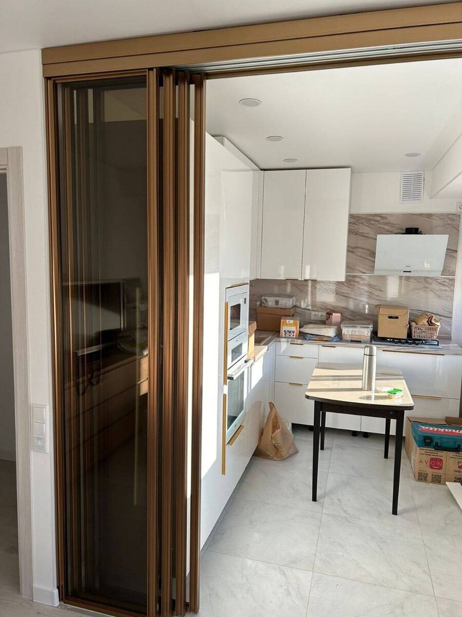 ⤵️ Здесь перегородка отделяет кухню с газом. Алюминиевый профиль — золотой анодированный, без перемычек. Стекло — прозрачное, чтобы сохранить максимум света. Из-за особенностей потолка стандартные решения не подошли, поэтому был выбран каскад из четырёх створок, которые закрываются влево, и одна распашная створка. Стационарную заказчики не хотели — и мы нашли решение, которое учло все пожелания и нюансы помещения. В итоге — функционально, эстетично. 🌟Если у вас нестандартная задача — напишите нам, мы найдём решение и для вашего пространства.