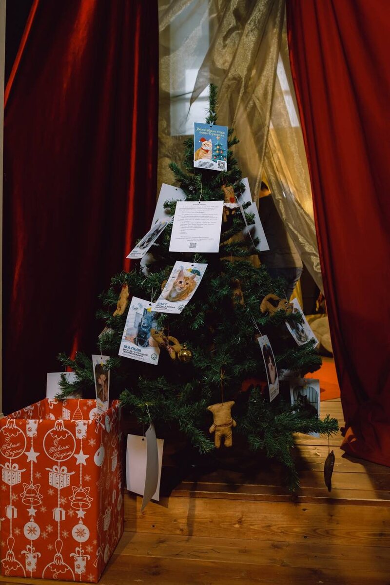 ? Это рыжий кот Суворов радуется Новому году! Да-да, в праздничные дни случаются самые разные чудеса. Вот и солнечный герой из Инициативной группы по защите животных стал обладателем волшебной ёлки, которая исполняет желания бездомных животных, и сапог-скороходов, чтобы доставлять им подарки. После перелома позвоночника Суворов никогда не сможет ходить, но это нисколько не мешает ему жить счастливой кошачьей жизнью и влюблять в себя абсолютно всех. ❓А что нам мешает поверить в чудо и дать ему случиться? Волшебная «Ёлка кота Суворова» или «Ёлочка добра» красуется слева от малой сцены на втором этаже театра. Вместо игрушек на ней – открытки с пожеланиями бездомных зверей. В этом году больше 50 пушистых написали письма Деду Морозу и надеются, что их мечты обязательно сбудутся. Кто-то мечатет о запасе корма, кто-то о новом ошейнике, старички заказали уютные лежанки или специальное питание. 📥 Каждый наш зритель может купить презент и положить его в специальный «волшебный ящик» под ё