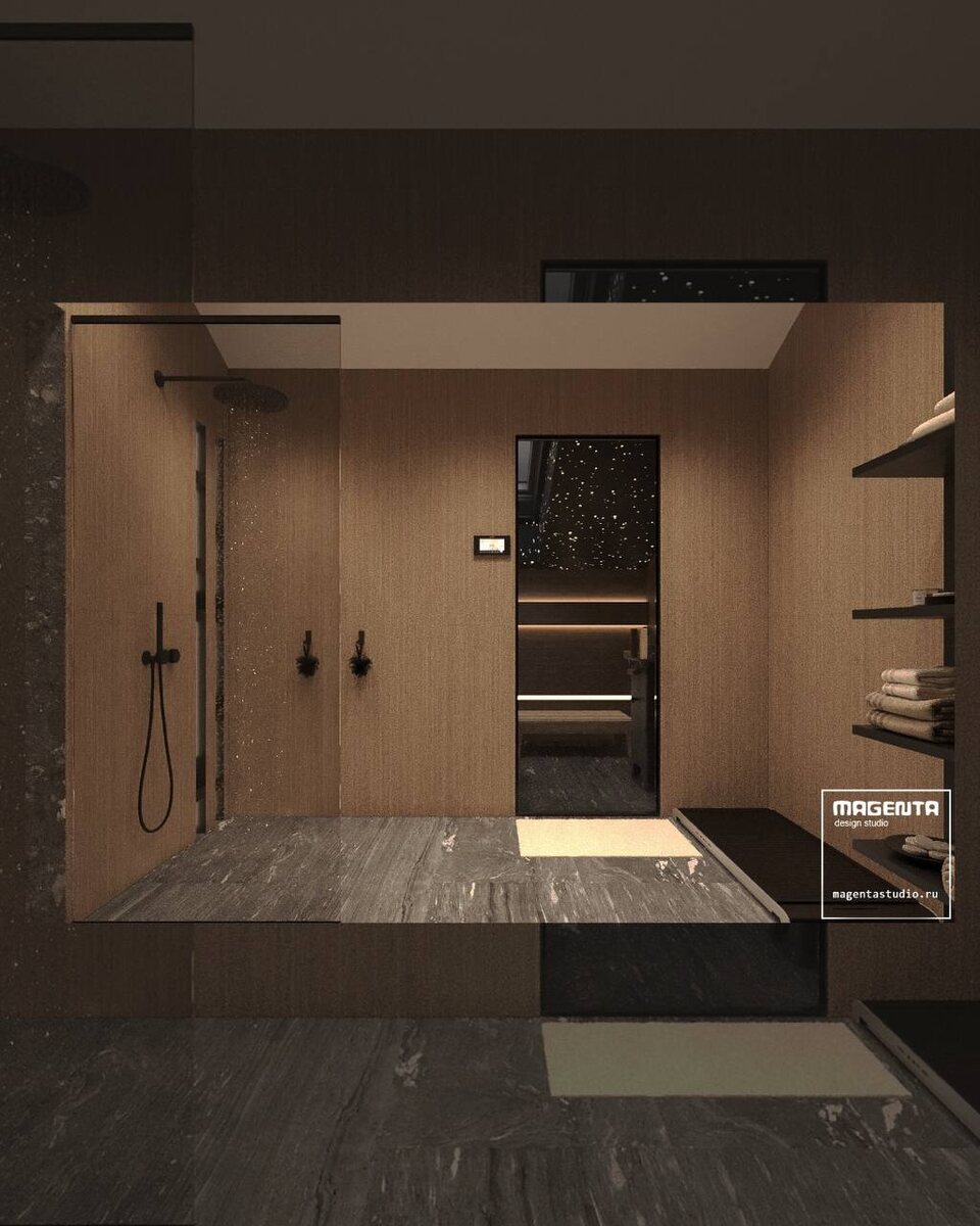 Эскизный проект бани в таунхаусе - пространство, созданное для разговоров без слов. Там, где тепло дерева и мягкий свет звездного потолка соединяют самое важное: ваше время и ваших близких. Многоуровневые полки-лежанки, на которых удобно лежать и мечтать вслух. Скрытая подсветка, превращающая обычный вечер в ритуал. И главное — «звёздное небо» над головой, под которым так легко договариваться о будущем. Это не просто баня - это ваша личная территория покоя и связи с теми, кто дорог. Прикоснитесь к дизайну класса А: портфолио реализованных проектов - на сайте magentastudio.ru Magenta