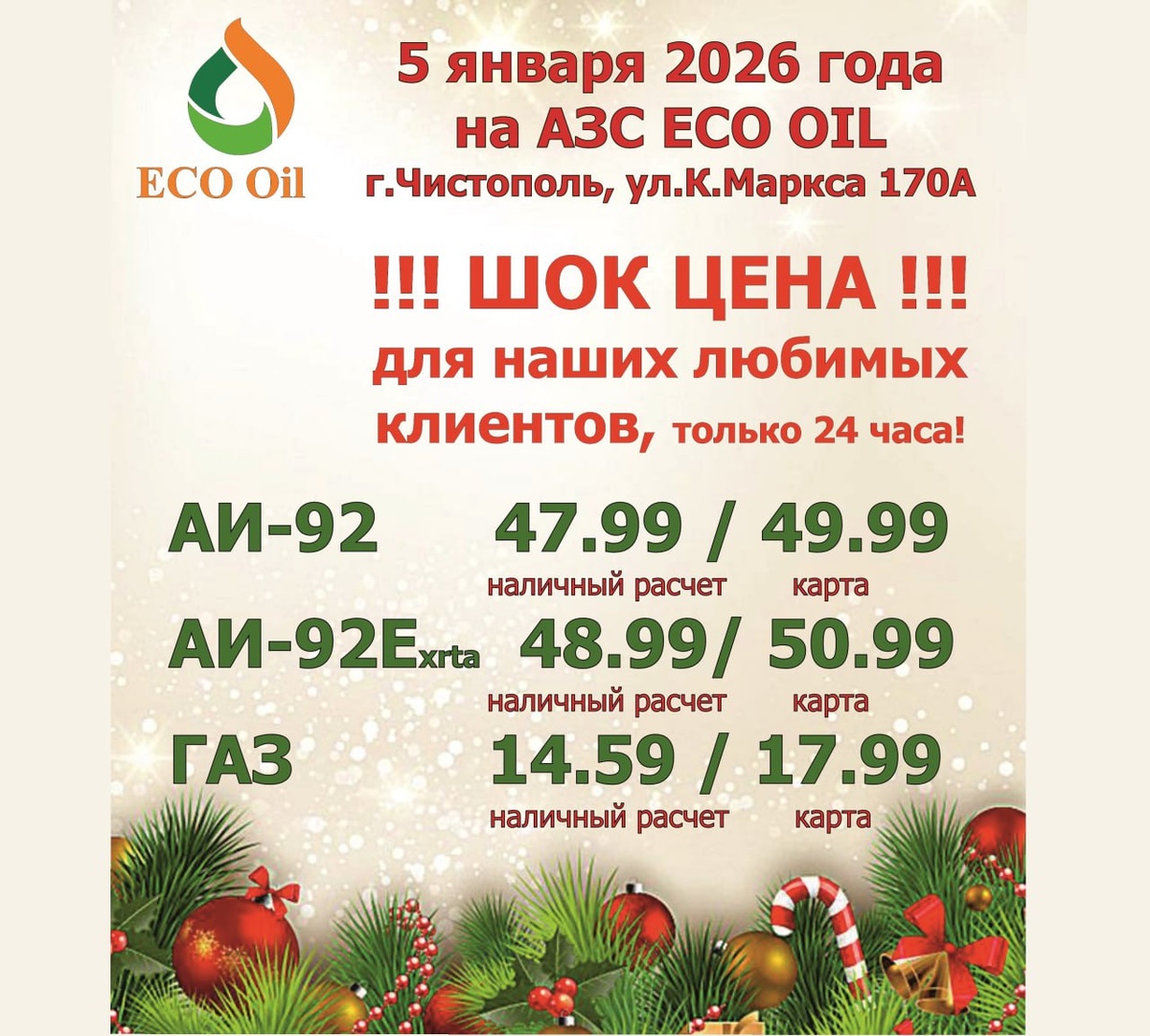 Всем доброго дня! На АЗС ECO Oil К.Маркса 170а 5 января 26г. с 00.00 ШОК ЦЕНА для наших любимых клиентов, только 24 часа! 🔥Аи-92 за 47.99р(нал расчет) / 49.99р(карта) 🔥АИ-92Extra за 48.99р(нал расчет) / 50.99р(карта) 🔥ГАЗ за 14.59р(нал расчет) / 17.99р(оплата по карте) 💥💥💥ВНИМАНИЕ! Акция только один день! Заправка производится только в бак транспортного средства. Подпишитесь на наш канал чтобы всегда быть в курсе наших акций. Поделитесь новостью с нашего канала https://t.me/ecooilrt !
