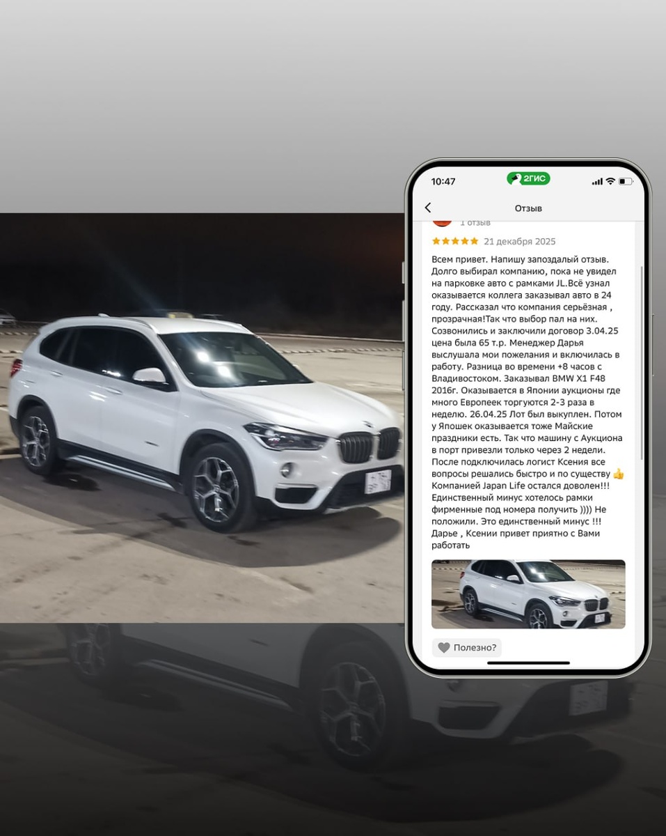 . Π‘ΠΎΠ·Π²ΠΎΠ½ΠΈΠ»ΠΈΡΡ ΠΈ Π·Π°ΠΊΠ»ΡΡΠΈΠ»ΠΈ Π΄ΠΎΠ³ΠΎΠ²ΠΎΡ 3.04.25 ΡΠ΅Π½Π° Π±ΡΠ»Π° 65 Ρ.Ρ. ΠΠ΅Π½Π΅Π΄ΠΆΠ΅Ρ ΠΠ°ΡΡΡ Π²ΡΡΠ»ΡΡΠ°Π»Π° ΠΌΠΎΠΈ ΠΏΠΎΠΆΠ΅Π»Π°Π½ΠΈΡ ΠΈ Π²ΠΊΠ»ΡΡΠΈΠ»Π°ΡΡ Π² ΡΠ°Π±ΠΎΡΡ. Π Π°Π·Π½ΠΈΡΠ° Π²ΠΎ Π²ΡΠ΅ΠΌΠ΅Π½ΠΈ +8 ΡΠ°ΡΠΎΠ² Ρ ΠΠ»Π°Π΄ΠΈΠ²ΠΎΡΡΠΎΠΊΠΎΠΌ. ΠΠ°ΠΊΠ°Π·ΡΠ²Π°Π» BMW X1 F48 2016Π³. ΠΠΊΠ°Π·ΡΠ²Π°Π΅ΡΡΡ Π² Π―ΠΏΠΎΠ½ΠΈΠΈ Π°ΡΠΊΡΠΈΠΎΠ½Ρ Π³Π΄Π΅ ΠΌΠ½ΠΎΠ³ΠΎ ΠΠ²ΡΠΎΠΏΠ΅Π΅ΠΊ ΡΠΎΡΠ³ΡΡΡΡΡ 2-3 ΡΠ°Π·Π° Π² Π½Π΅Π΄Π΅Π»Ρ. 26.04.25 ΠΠΎΡ Π±ΡΠ» Π²ΡΠΊΡΠΏΠ»Π΅Π½. ΠΠΎΡΠΎΠΌ Ρ Π―ΠΏΠΎΡΠ΅ΠΊ ΠΎΠΊΠ°Π·ΡΠ²Π°Π΅ΡΡΡ ΡΠΎΠΆΠ΅ ΠΠ°ΠΉΡΠΊΠΈΠ΅ ΠΏΡΠ°Π·Π΄Π½ΠΈΠΊΠΈ Π΅ΡΡΡ. Π’Π°ΠΊ ΡΡΠΎ ΠΌΠ°ΡΠΈΠ½Ρ Ρ ΠΡΠΊΡΠΈΠΎΠ½Π° Π² ΠΏΠΎΡΡ ΠΏΡΠΈΠ²Π΅Π·Π»ΠΈ ΡΠΎΠ»ΡΠΊΠΎ ΡΠ΅ΡΠ΅Π· 2 Π½Π΅Π΄Π΅Π»ΠΈ. ΠΠΎΡΠ»Π΅ ΠΏΠΎΠ΄ΠΊΠ»ΡΡΠΈΠ»Π°ΡΡ Π»ΠΎΠ³ΠΈΡΡ ΠΡΠ΅Π½ΠΈΡ Π²ΡΠ΅ Π²ΠΎΠΏΡΠΎΡΡ ΡΠ΅ΡΠ°Π»ΠΈΡΡ Π±ΡΡΡΡΠΎ ΠΈ ΠΏΠΎ ΡΡΡΠ΅ΡΡΠ²Ρ π ΠΠΎΠΌΠΏΠ°Π½ΠΈΠ΅ΠΉ Japan Life ΠΎΡΡΠ°Π»ΡΡ Π΄ΠΎΠ²ΠΎΠ»Π΅Π½!!! ΠΠ΄ΠΈΠ½ΡΡΠ²Π΅Π½Π½ΡΠΉ ΠΌΠΈΠ½ΡΡ Ρ