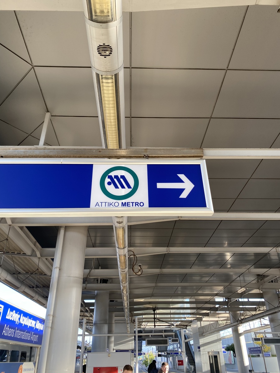 Первое, что бросилось в глаза - логотип афинского метро. Вкусно и точка, видимо, вдохновлялась именно этим логотипом 😁. Стоимость проезда из аэропорта до центра города - 9 евро. Билет можно купить в автомате, в котором есть английский язык. Все достаточно интуитивно понятно.