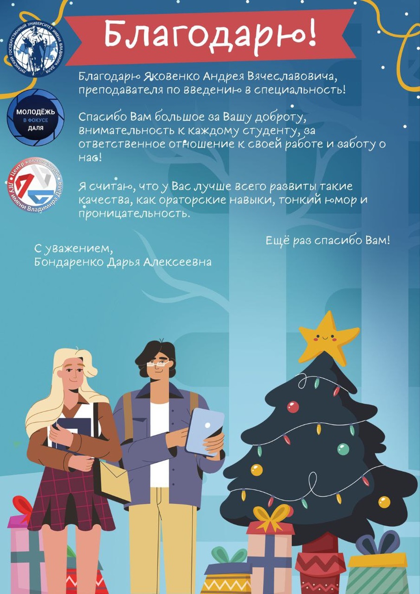 ! Сегодня студенты решили поздравить этих преподавателей: 〰️ Яковенко Андрей Вячеславович; 〰️ Даренский Виталий Юрьевич; 〰️ Нередкова Светлана Сергеевна; 〰️ Клименко Александр Сергеевич; 〰️ Раковская Наталья Леонидовна; 〰️ Платохина Наталья Андреевна. Следите за нашими обновлениями, чтобы увидеть ещё больше приятных слов благодарностей! 🎀 🤩 Молодёжка также уже ждёт вас на RUTUBE и Дзен, подписывайтесь!