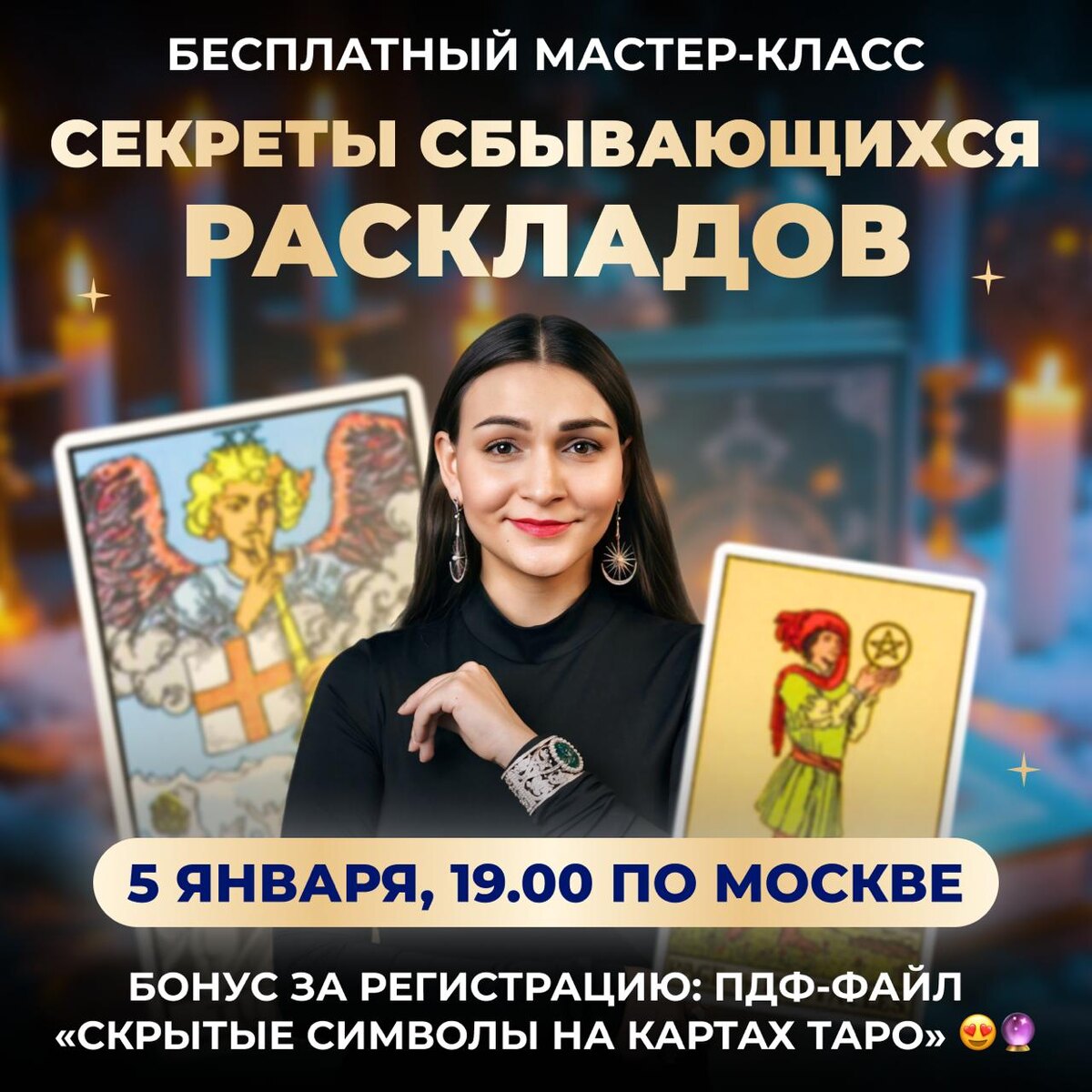 Тогда жду вас на моем новом бесплатном мастер-классе: 🔮 «СЕКРЕТЫ СБЫВАЮЩИХСЯ РАСКЛАДОВ» Если вы устали плавать в трактовках и хотите читать карты легко и уверенно – это ваш знак⚡️ 🗓️ Мастер-класс пройдет уже 5 января в 19:00 по МСК. Обязательно поставьте себе напоминание, потому что записи эфира НЕ БУДЕТ! Всю информацию получат только те, кто будет на нем. Цель этого этого мастер-класса – разложить все по полочкам🤌🏼 Я поделюсь своими секретами и личными наработками, чтобы ваши расклады: 🔹 были точными и попадали в суть 🔹 вызывали эффект «вау, как ты это увидела?» 🔹 складывались в цельную историю, а не хаотичный набор картинок 🔹 и реально сбывались 🔥 Также, у нас с вами будет практика чтения раскладов! Мы разберем конкретные примеры, чтобы вы наглядно увидели, как читать сочетания карт в раскладах. «Посмотрю пару видео на YouTube, загуглю значения карт, почитаю книжку и вот, я почти таролог!» Такие заблуждения я все чаще вижу у тех, кто пытается изучать таро самостоятельно ⬆️