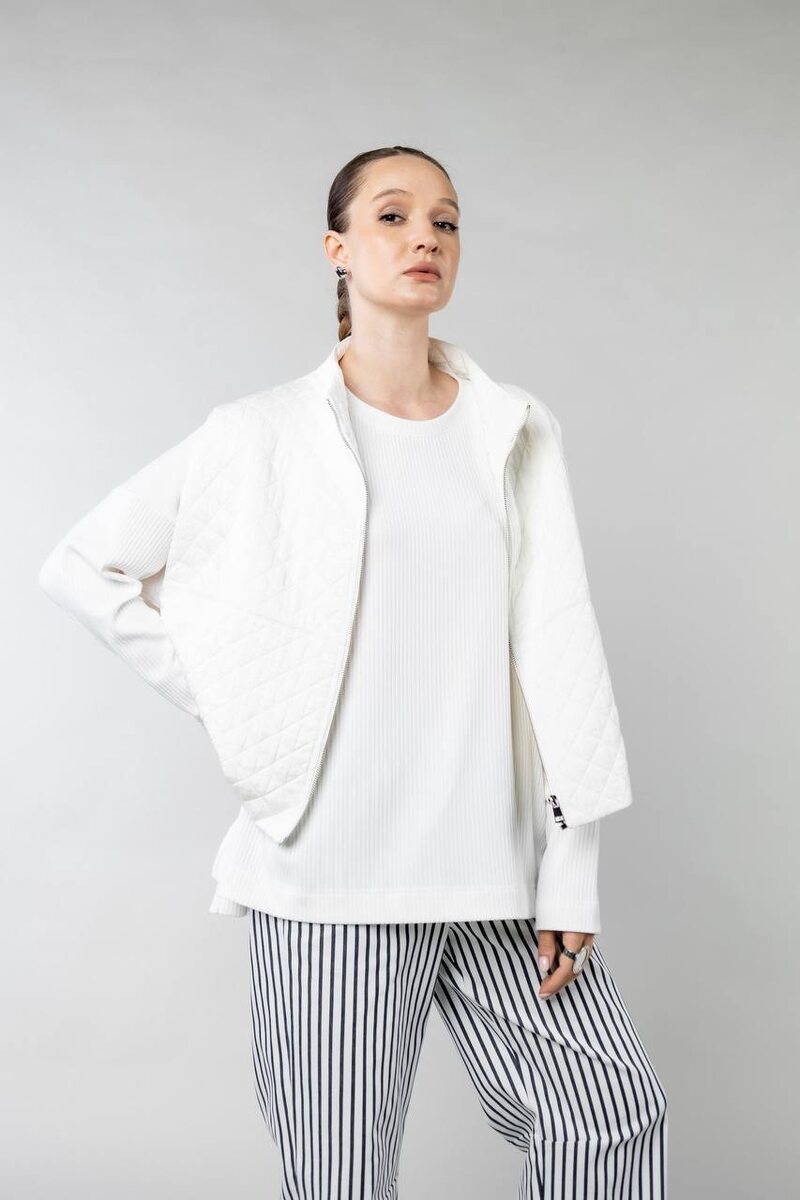 ▪️Укороченный жилет в белом цвете - удобный элемент гардероба. Он выполнен из ткани имитирующей стежку. Идеален, чтобы положить в свой шоппер и не переживать о смене погоды.